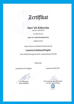 das Zertifikat zum Laserschutzbeauftragten nach bestandener Prüfung bekommen.